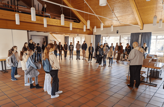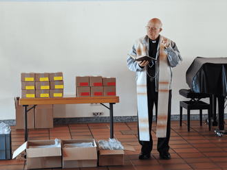 Um 09:15 Uhr trafen wir uns im Pfarrheim. Bevor wir losgehen konnten, segnete Pfarrvikar Lischka die Osterkerzen und sprach einen Segen für den Weg aus. In Kleingruppen von zwei oder drei Messdienerinnen oder Messdienern und einem OM machten wir uns auf den Weg durch ganz Alfter.